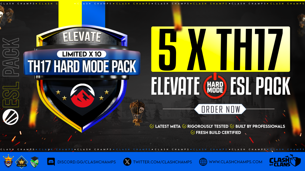 Are you ready to take your Clash of Clans experience to the next level? Introducing the limited edition Th17 x 5 Elevate Limited Hard Mode ESL Pack from the Elevate team! The Pro Base Pack is curated by Bernaul, Aquiles, Celinho, Patolino, and Leo and isn’t just any other base layouts; it’s masterpieces crafted by a true champion. Designed with precision and insight gained from years of competitive play, this pack offers a strategic advantage that can’t be understated. Whether you’re aiming to climb the ranks in the leaderboards or dominate in clan wars, Th17 x 5 Elevate Limited Hard Mode ESL Pack provides the foundation for success. Don’t miss out on this opportunity to harness the wisdom of seasoned pros and revolutionize your Clash of Clans journey. Upgrade to the Limited Edition Pro Base Pack today and embark on a path towards victory like never before.