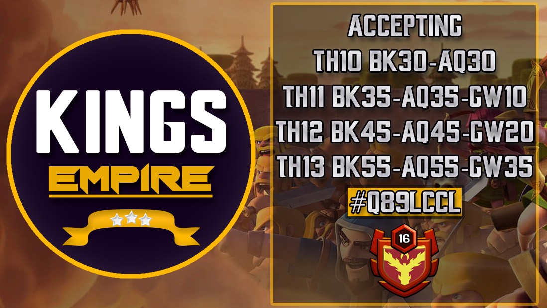 King's Empire LVL16Welcome To Kings Empire! Relaxed ClanRecruiting Active PlayersPush/War/Farm/Games ClanB2B Wars AlwaysMore about us in our Discord. JOIN DISCORD >>> mmcJB66 |