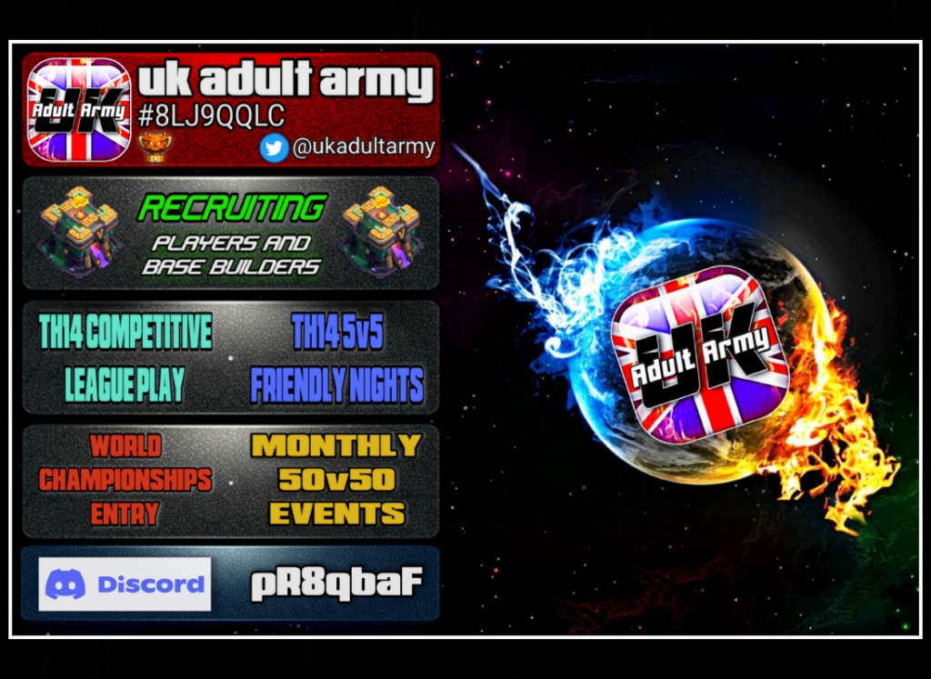UK Adult ArmyFair Play Adult War Clan Established in 2014, core founding members and long time members. We have grown over the years and have two main clans in our family UK Adult Army & Full English. We take part in Competitive League Wars as well as running Regular Wars, monthly Event Wars and SCCWL. Join the action NOW! |