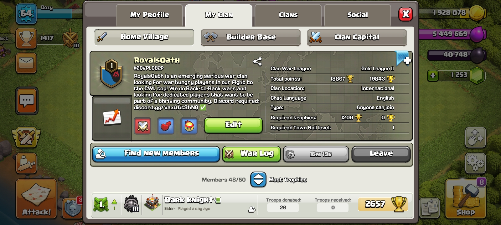 Royal Kingdom 2Looking for active members. Try your best in war and use both attacks. Get as much points as you can in clan games. Do the best you can and don be afraid to learn more. Discord: discord.gg/sSHFrsK |