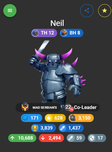 current clan: BLEACH current community: Clash Chatiki1987 is my discord my tag in game is #C8V9R8GP - Never miss any war / clan cap/ max CG always - I used to be a very old coc players back when heros had black hp bars and builder base wasnt in the game, when dark troops were still being brought in the game -i quit for many years and now i am back i made it to th 16 everything looking good i made it legend league still learning meta attacks i average 2 stars high or 3* i have 1500 stars in wars total -my in game knowledge is decent but my weak point is adjusting to the meta sometimes -i expect nothing from the clan just being active is excellent i don mind if its competitive too - I ALWAYS HAVE HERO POTS FOR CWL SINCE MY HERO LEVELS ARE UNDERWHELMING |