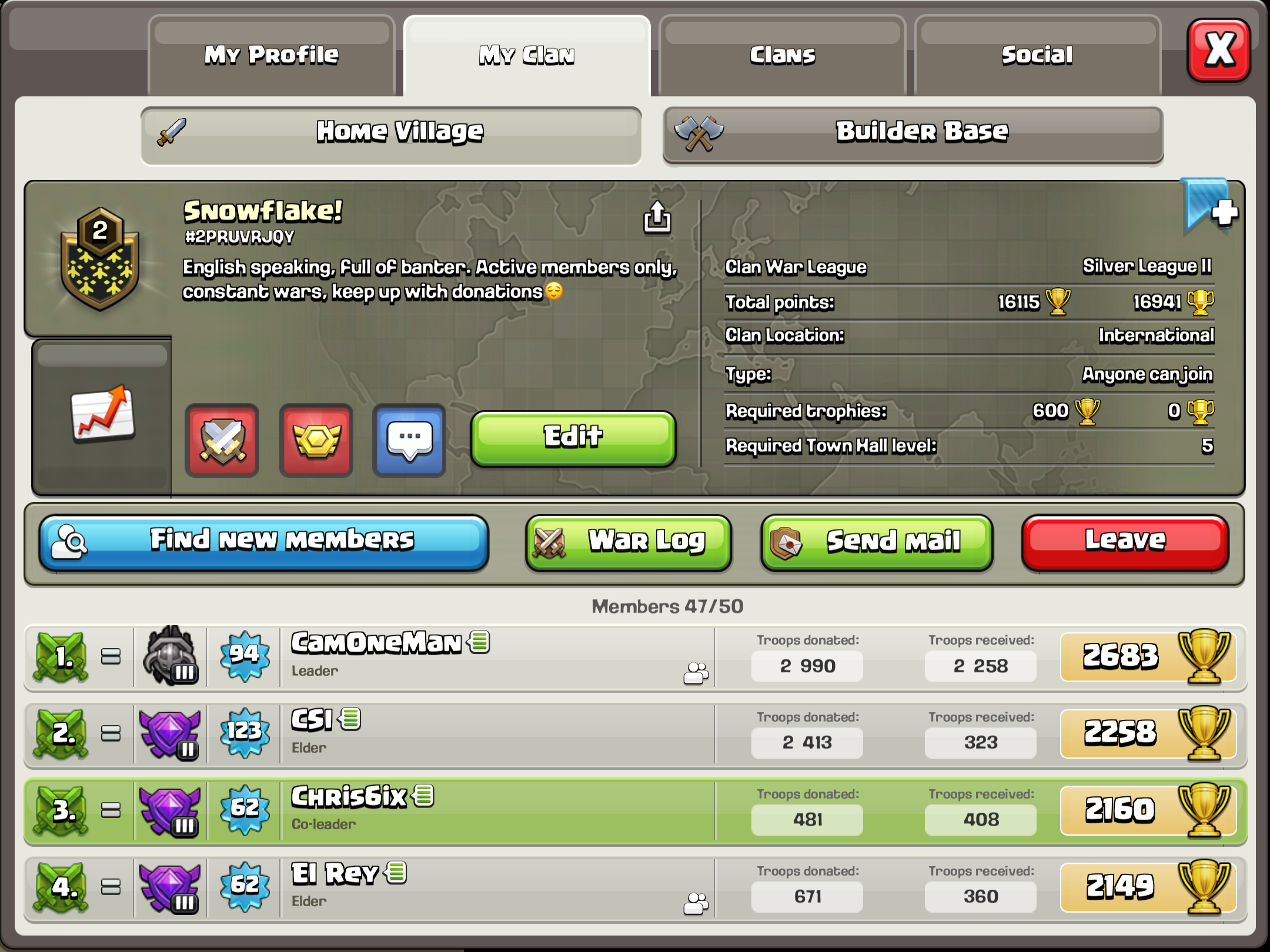 Snowflake!English Speaking, full of banter. Active members only, constant wars, keep up with donations. |