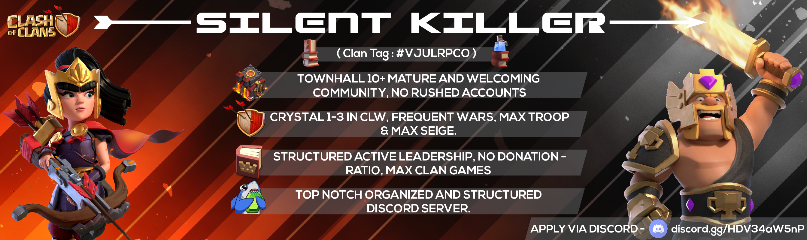 Silent KillerWhat we are looking for TH10+ No Rushed bases Active daily War veterans Discord is required to participate in war / leadership promotions No donation ratios as long as they are not 2x receive Respectful friendly members Long term members What we have to offer Organized Discord server Leadership roles are earned Clash of clans bots Friendly community Active members through the day Clan war | 5v5, 10v10, 15v15 Max Donations Level 2 Discord server (10 boosts) Role Icons in server Pro Bases given for free to server boosters |
