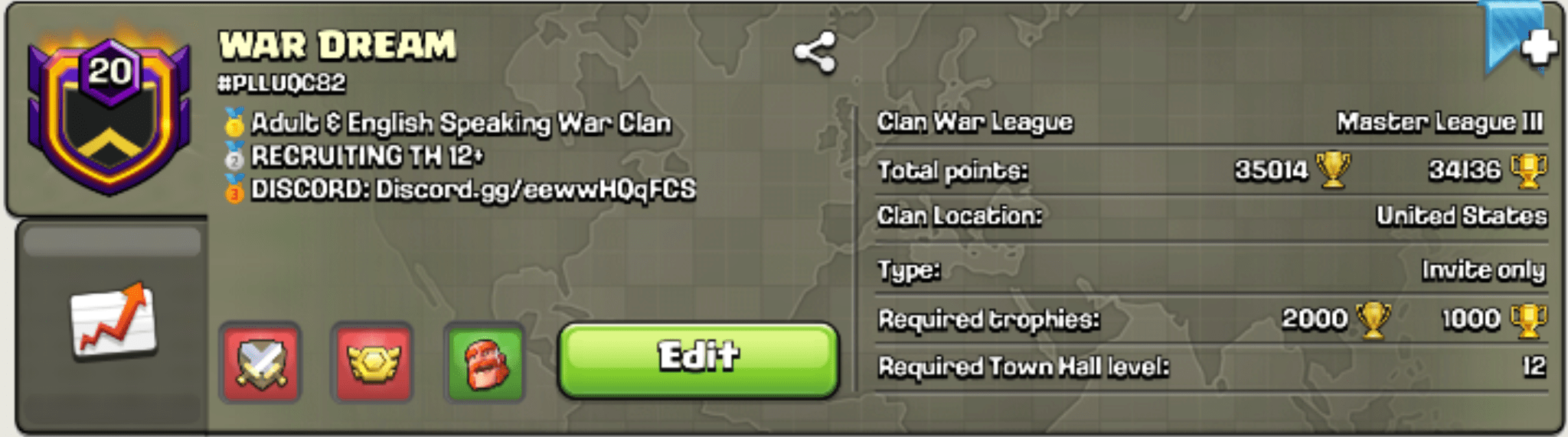 Arcane GodAdult war clan. Be active to get promoted. No rushed bases and no second farming accounts. No need to attack your mirror, but must attack for 3 stars! Be kind or get the boot Discord: C2UbtXHBx6 Our Subsidiary clan (#2QP2OPLLU) |