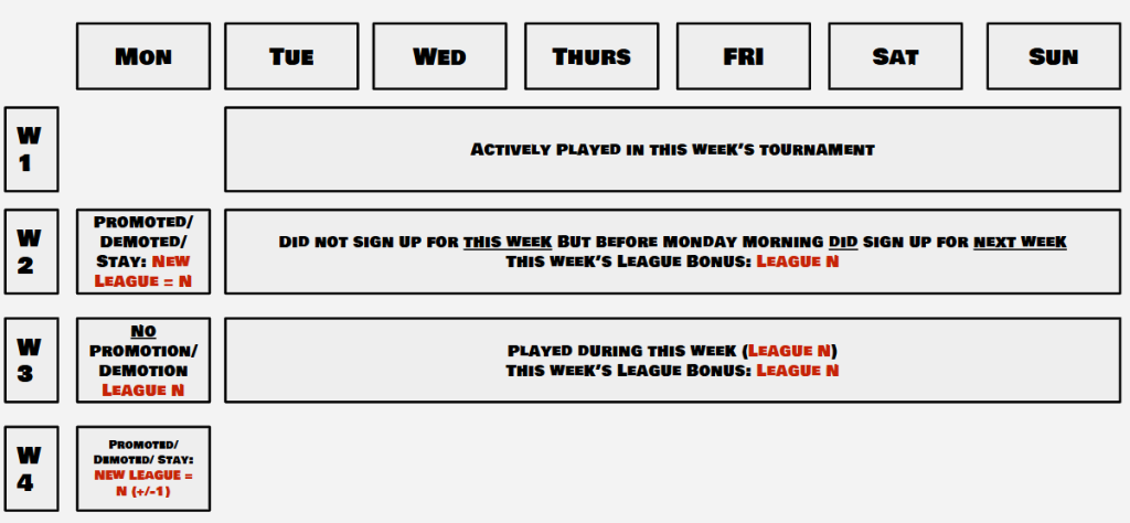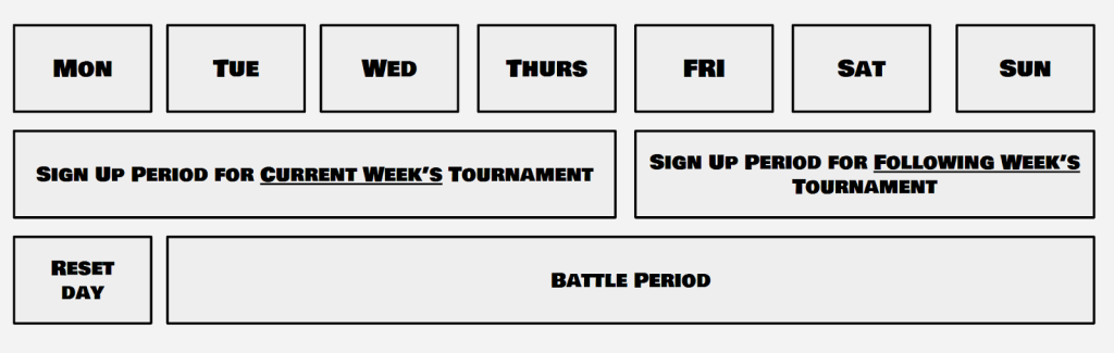 - Players sign up Monday–Friday; battles begin Tuesday.