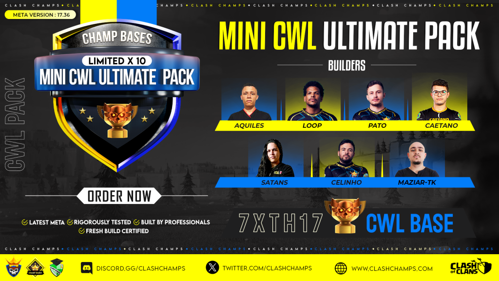 The MINI CWL ULTIMATE TH17 Limited ESL Pro Base Pack fulfills your clan’s wish list for the upcoming Clan War Leagues. Not only does it contain 7 x TH17 bases built and tested by some of the very best builders in the world, but there are only 10 slots available ensuring exclusivity. With fifteen bases included in the pack, you’ll have a variety of options to choose from depending on your strategy and playstyle. By purchasing the Ultimate CWL pack, you’ll have a competitive advantage in Clash of Clans thanks to the expertise of the professional builders who designed the bases. Overall, the Ultimate CWL pack is a great investment for any Clash of Clans player looking to take their game to the next level. It’s a unique opportunity to get access to professionally designed bases that will give you a competitive edge in the game.
